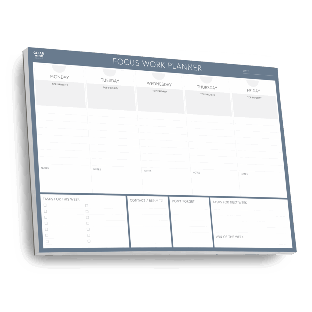 Planning your Monday to Friday work week, wether that's all in one go or day, by day takes decisions out of your head. This gives you space to think clearly and feel calmer throughout the week.