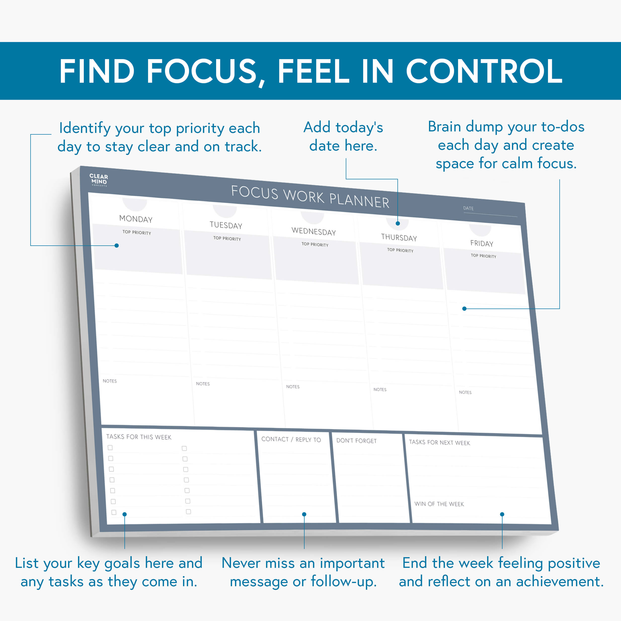 The planner gives everything a place - priorities, tasks, notes, who to respond to, things to not forget and what can wait until next week. This helps your week feel structured and easier to manage.