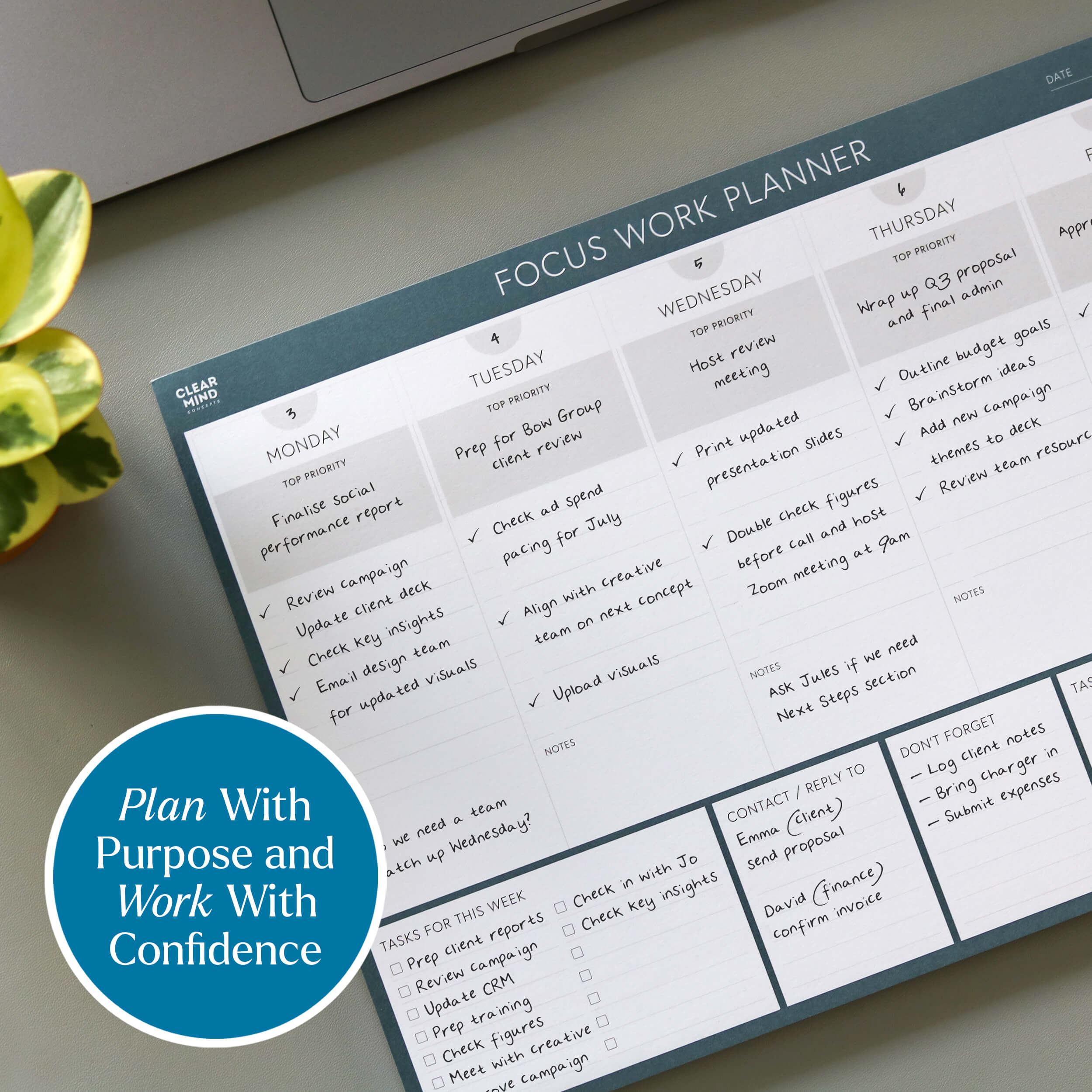 A clear weekly layout removes the noise so you can direct your attention to the tasks that genuinely move your work forward and make you feel like you're achieving every single day.